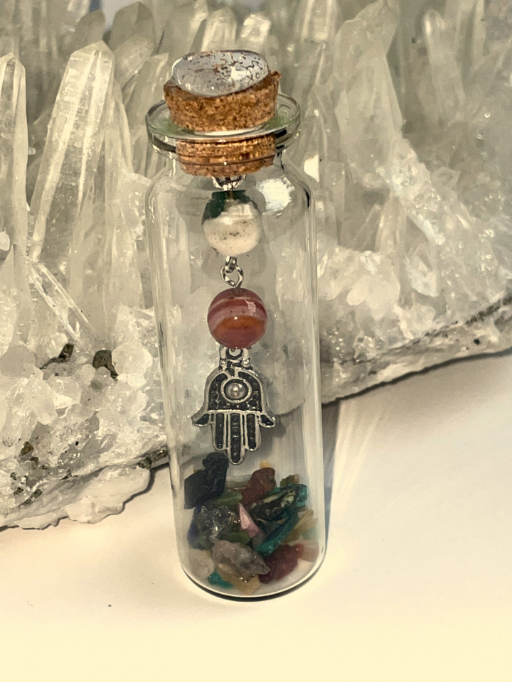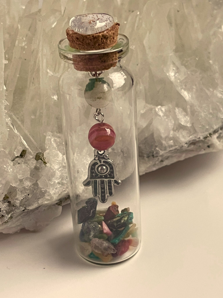Een glazen flesje gezondheid, geluk en liefde, met een Tibetaans zilveren bedel "Hamsa Hand", bergkristal hartje op de deksel en ruwe Edelsteentjes;